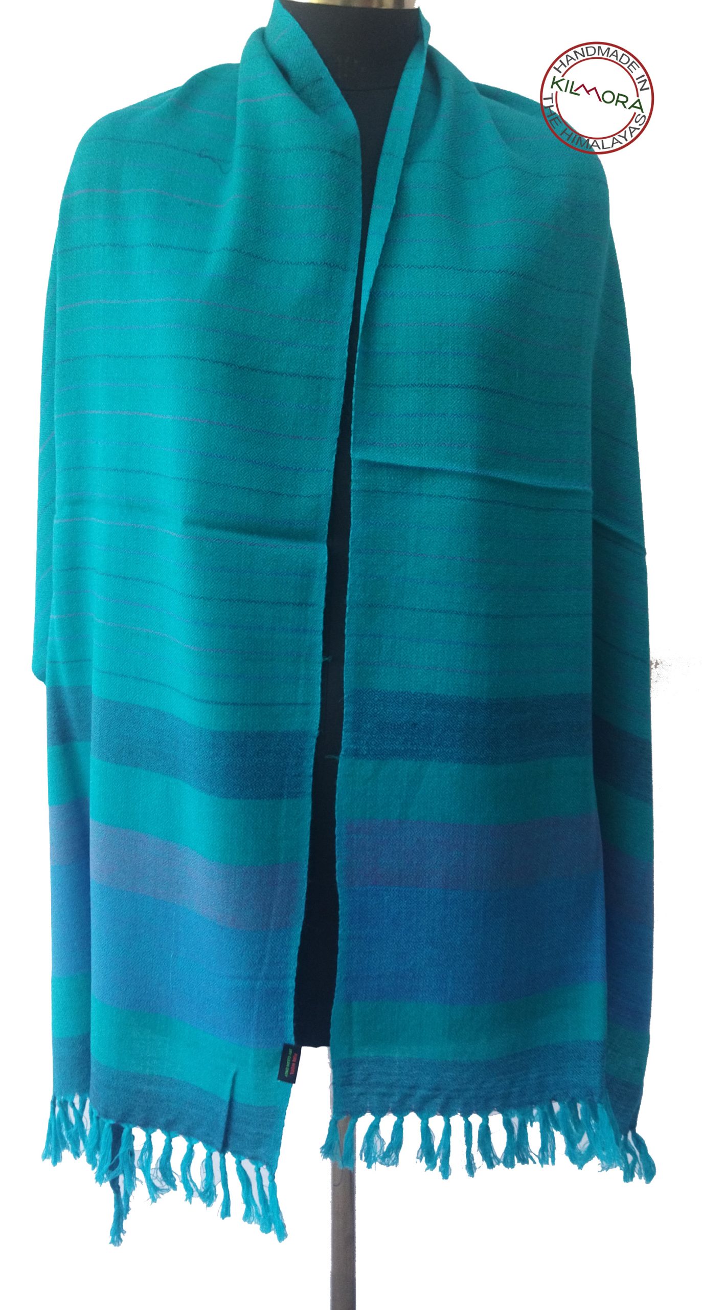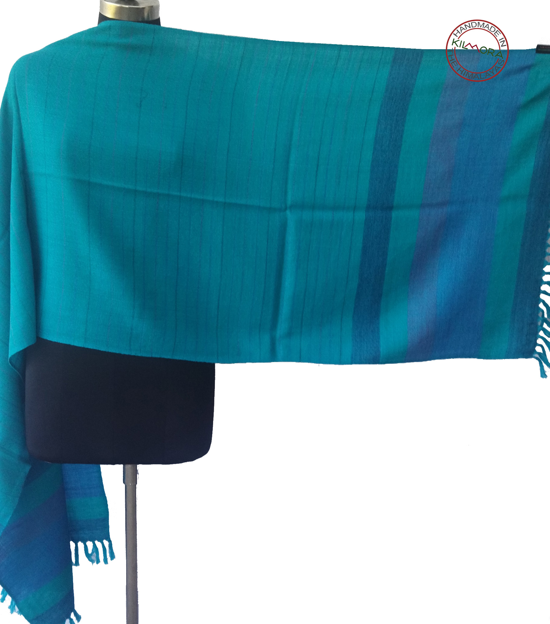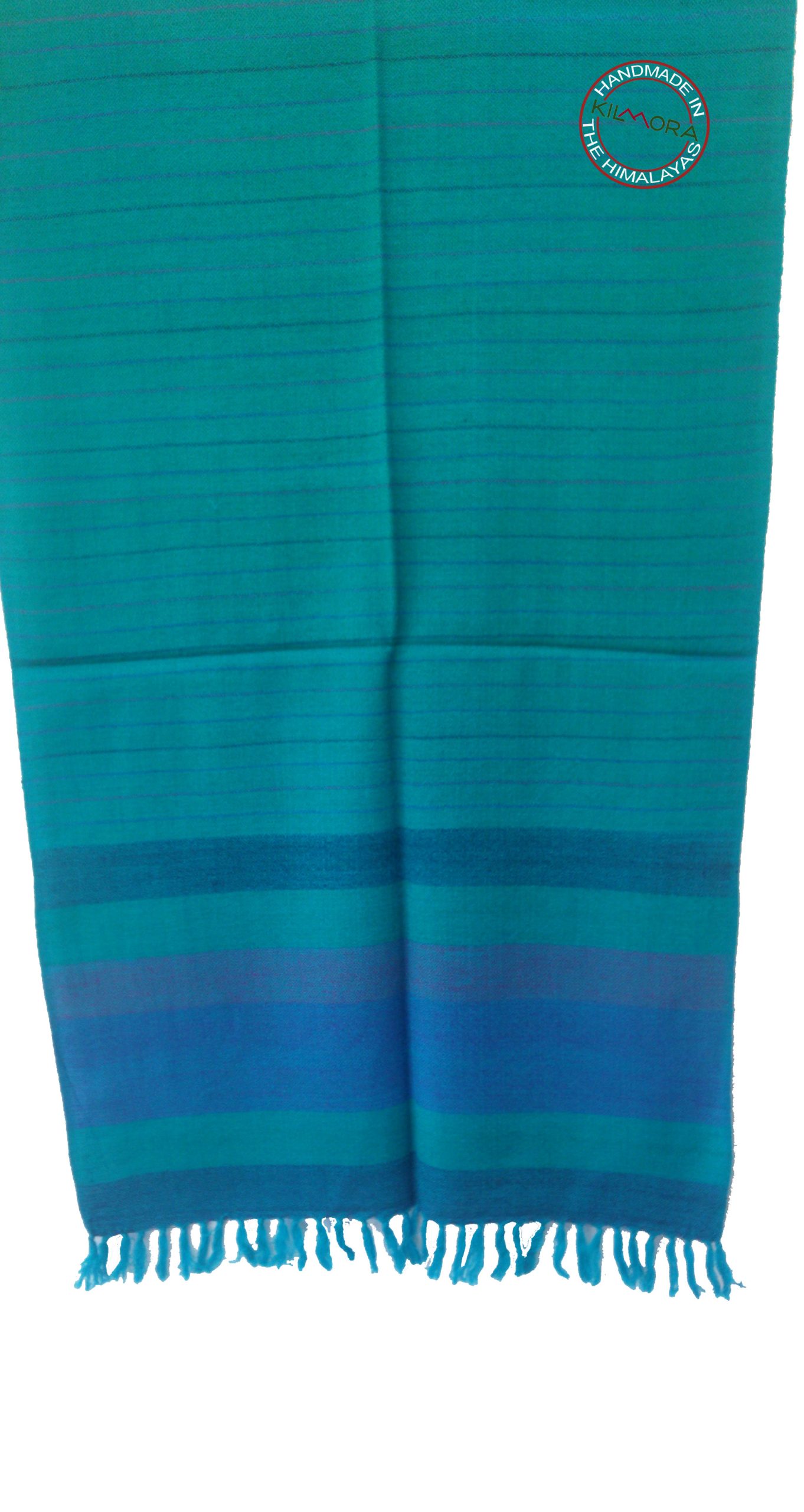 Elegantly simple woollen stole in teal blue with aegean blue border.